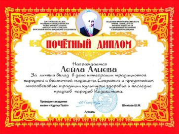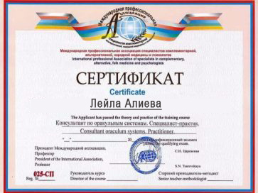 Лейла алиева - сильная ясновидящая в седьмом поколении, феноменальная гадалка, медиум, человек- рентген, заслуженная целительница Казахстана. Опыт работы: 26 лет.